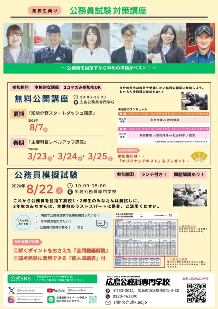 公務員試験対策講座(高校生向け)を以下の日程で実施いたします。
